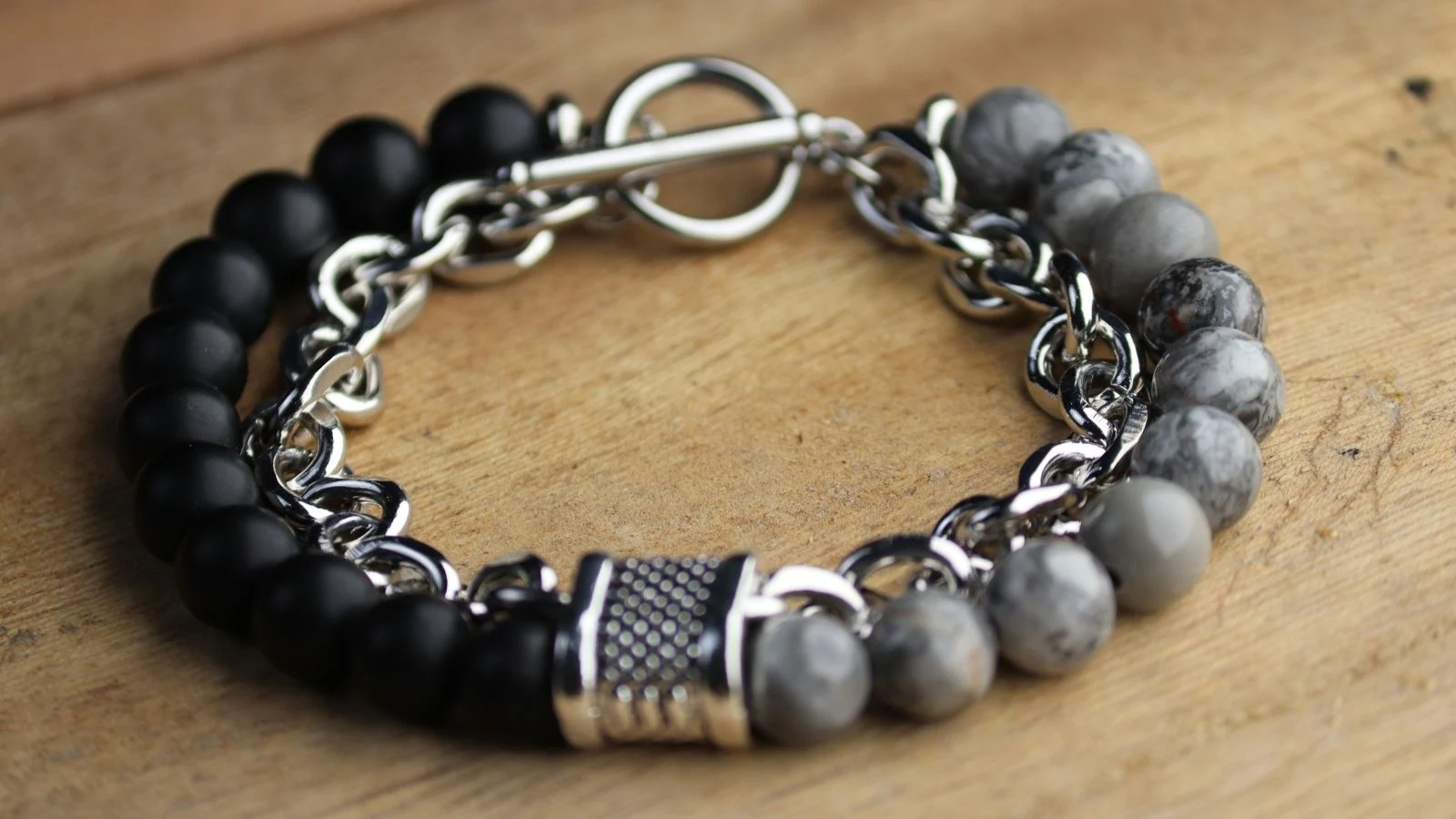 The Dual Beaded & Silver Chain Men’s Bracelet is a statement piece that blends rugged charm with refined style. Crafted with matte black and gray marbled beads, it features a durable silver-toned chain that adds a touch of strength and masculinity. The centerpiece connector enhances its modern appeal, while the toggle clasp ensures a secure and comfortable fit. Perfect for both casual and semi-formal wear, this bracelet complements any outfit with effortless elegance.