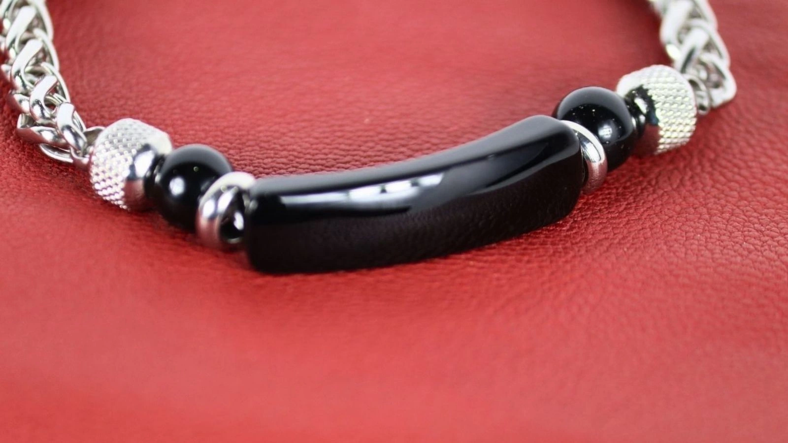 The Men’s Black Onyx & Steel Chain Bracelet from Different Hypes embodies the perfect balance of strength and sophistication. Crafted with a polished black onyx center bar, textured metallic beads, and a durable stainless-steel chain, it exudes both luxury and resilience.